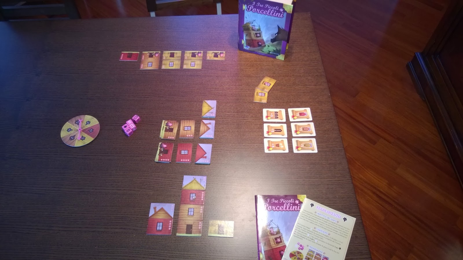 Se esce una coppia di porte, finestre o tetti preleveremo la rispettiva tessera in "paglia", con un tris in "legno" e con 4 simboli uguali di "mattoni".